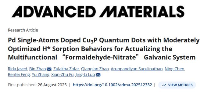 《具有適度優化氫吸附 / 脫附行為的鈀單原子摻雜磷化亞銅量子點,用于實現多功能“甲醛 - 硝酸鹽"原電池體系》發表于中科院一區頂刊《Advanced Materials》,由趙斌教授團隊牽頭完成。該研究針對“甲醛 - 硝酸鹽"電化學體系現存的功能單一、催化性能受限等問題,創新設計出鈀(Pd)單原子摻雜磷化亞銅(Cu?P)量子點催化劑。